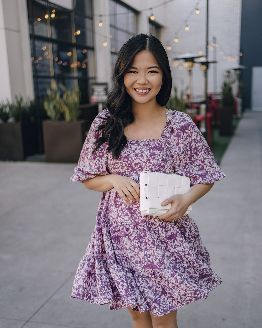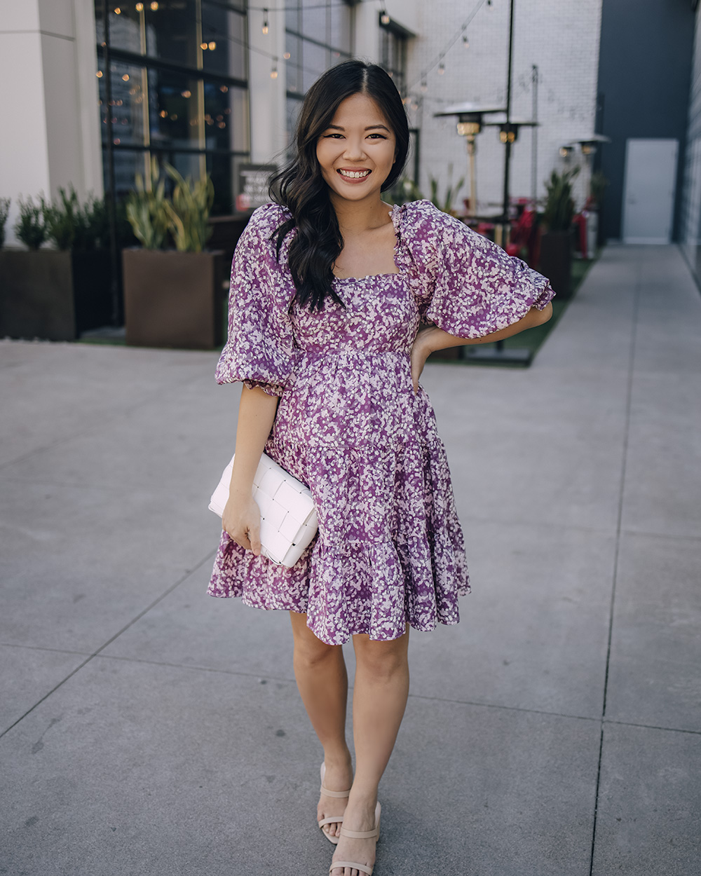 Purple floral print dress with puff sleeves (S) / White woven clutch / Nude strappy mules (6.5 TTS – also comes in black and gold) (all c/o Red Dress) / Charlotte Tilbury lipstick in ‘Pillow Talk’