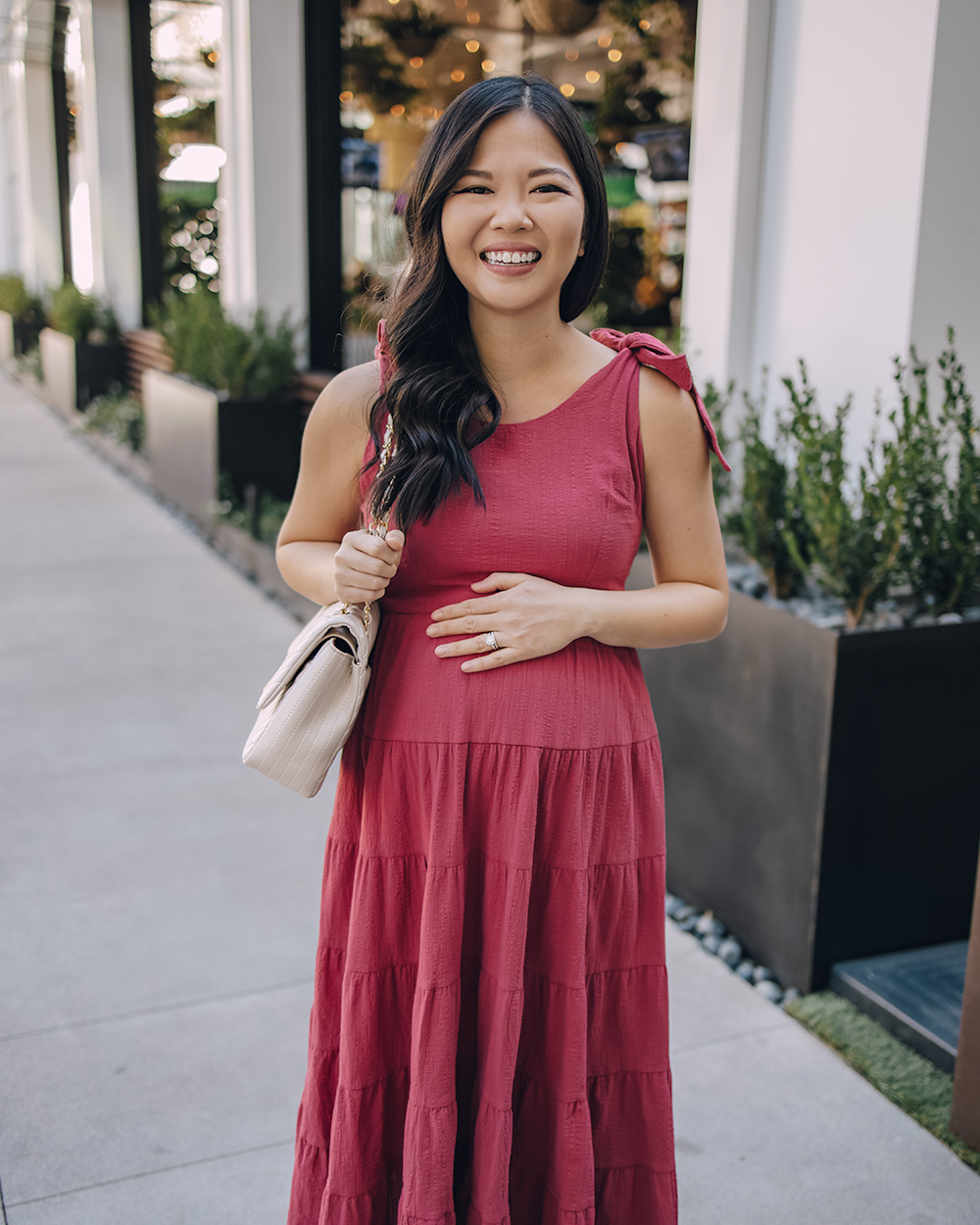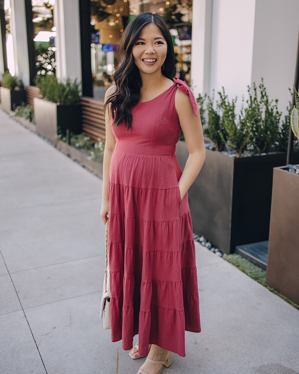 I love the tie straps at the shoulders (bonus points because it makes the top adjustable!), the tiered skirt and the fact that it’s both petite- and bump-friendly. I’m 5’2″ and it hits me as a maxi dress, but would probably hit as a midi dress for taller gals. This would be a great wedding guest dress, bridal or baby shower dress, Easter dress or just something you wear for a weekend brunch – it’s that good and comes in cream and light blue, which are also both perfect for spring!