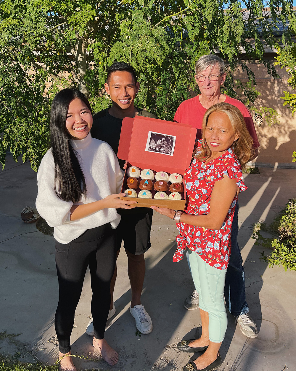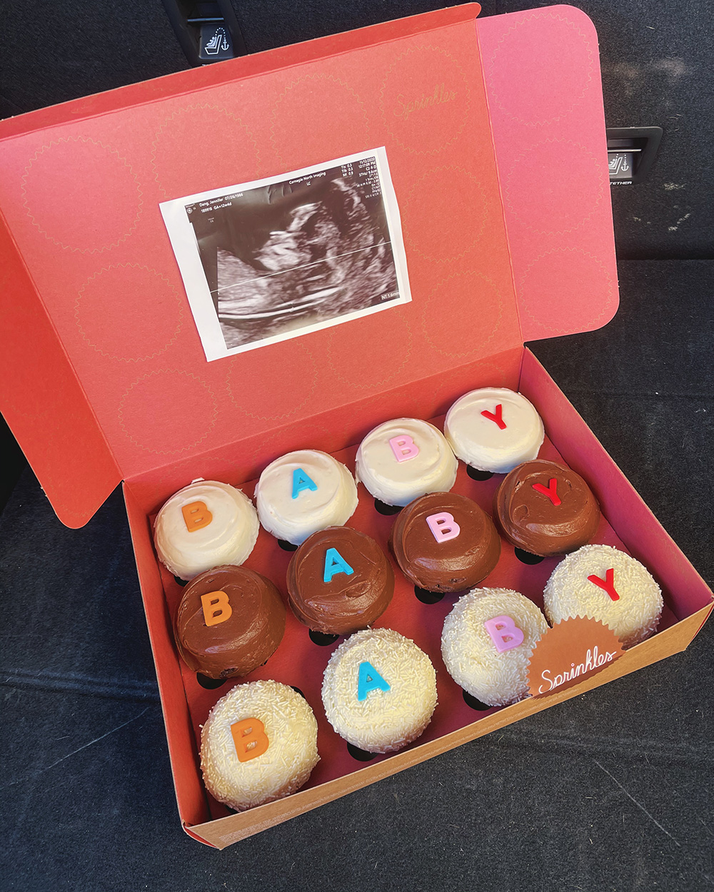 For James’ parents, we had my brother-in-law and sister-in-law bring over Sprinkle cupcakes that said BABY and inside the box lid was the sonogram.