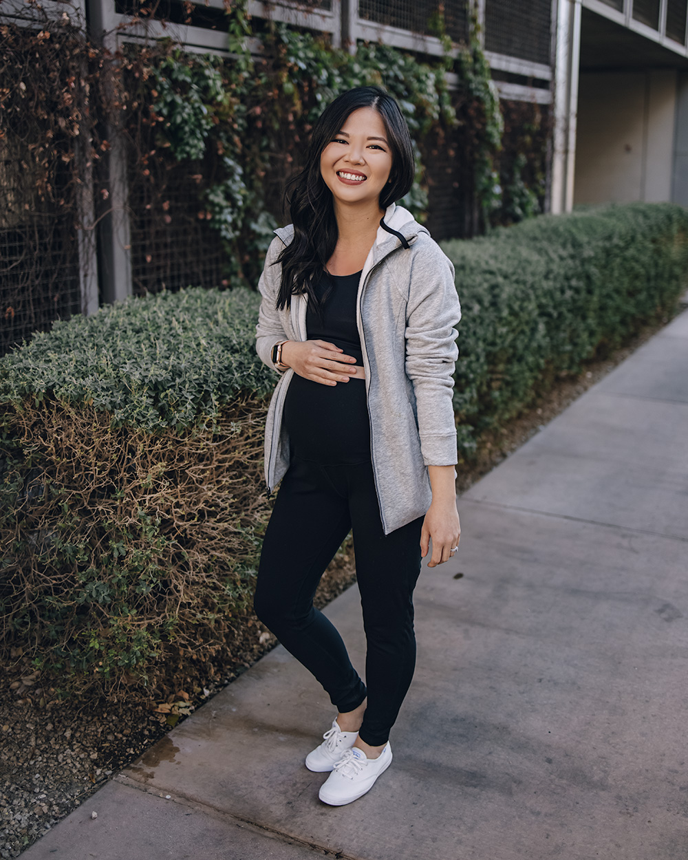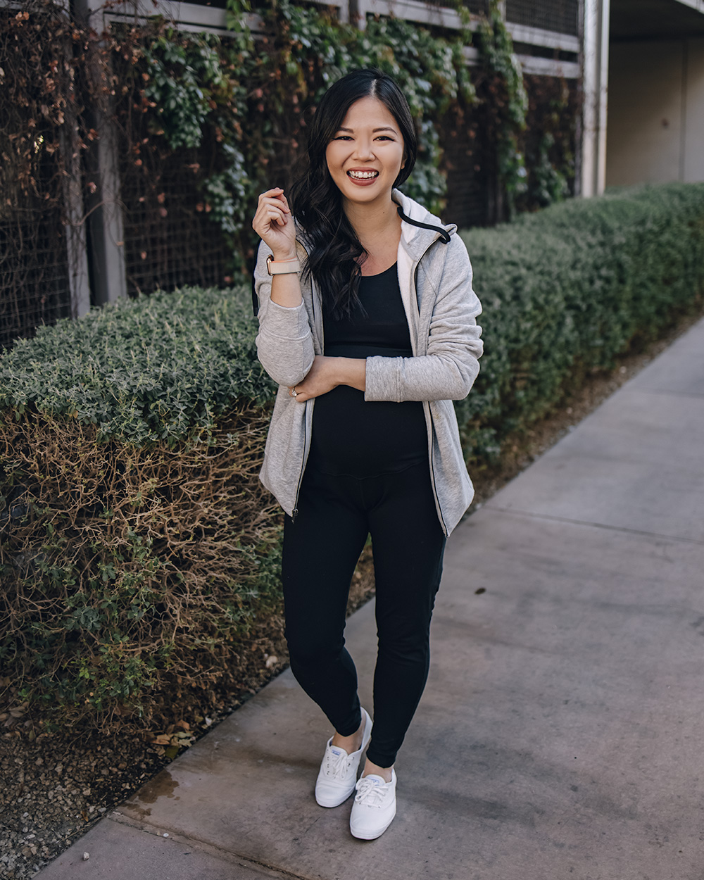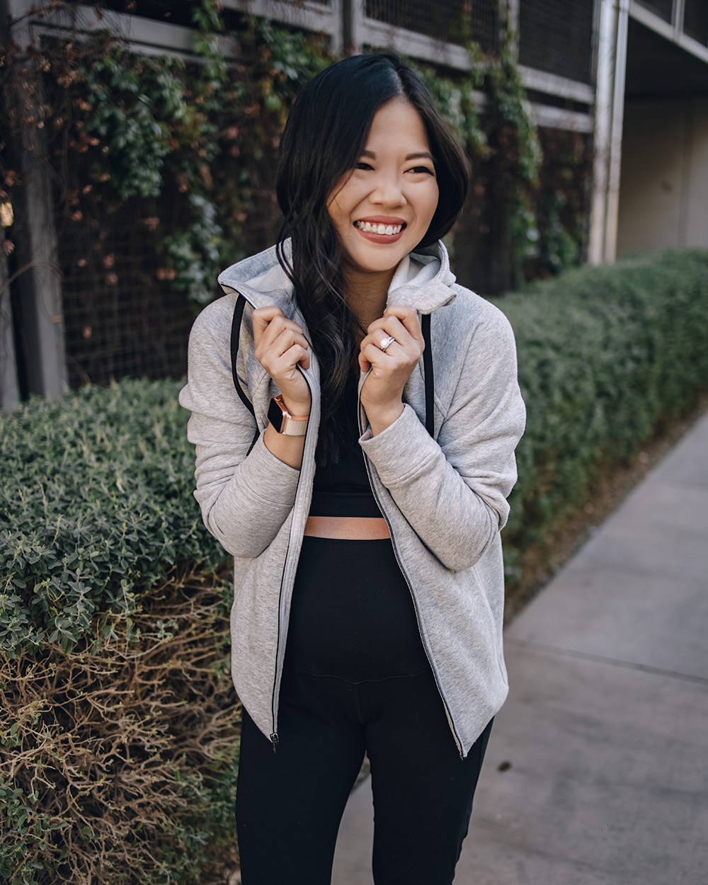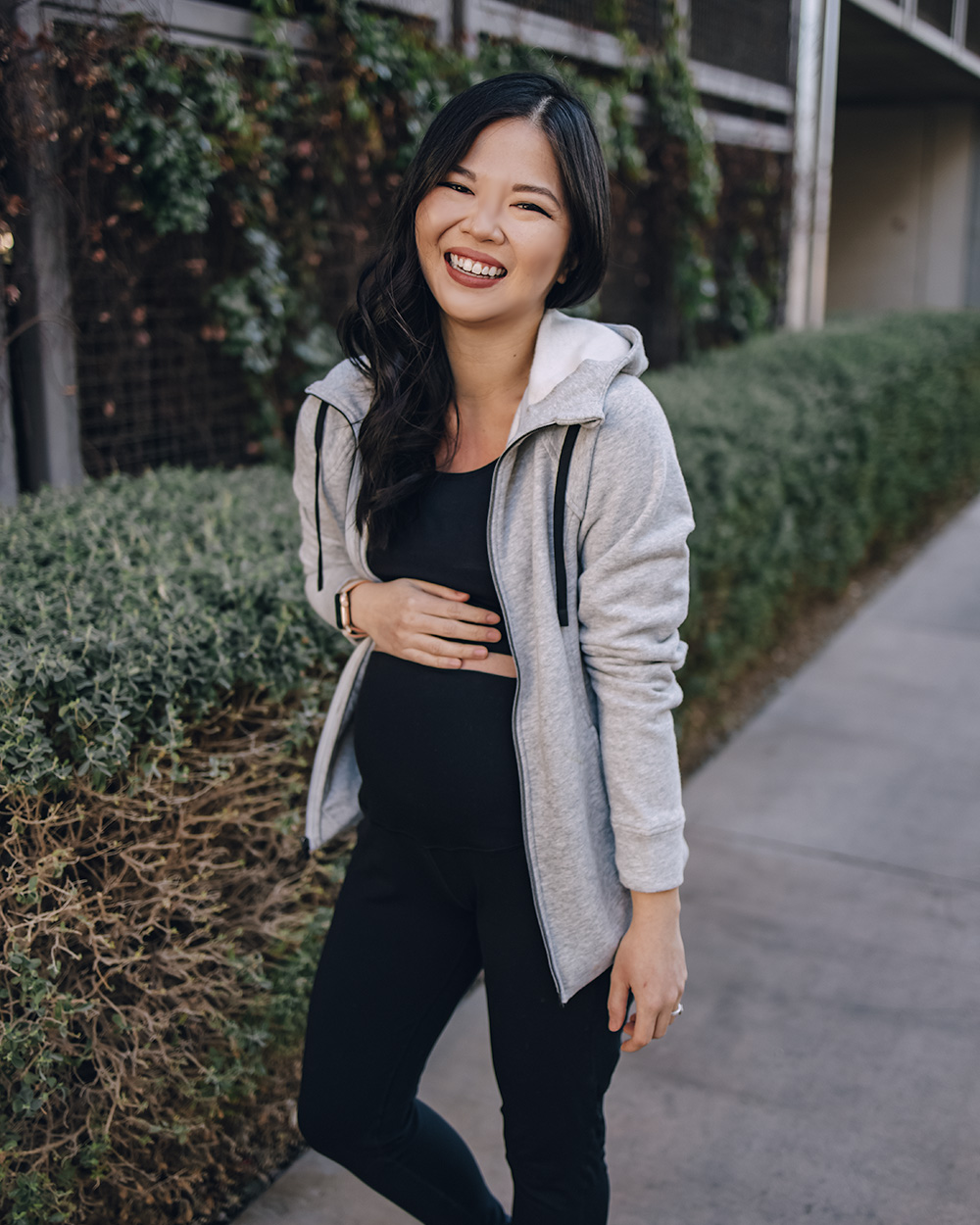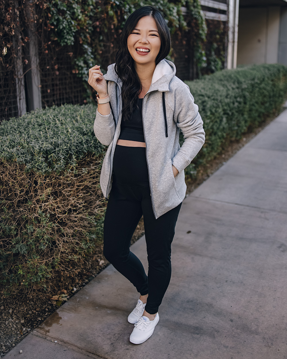 Gray zip up hoodie with thumbholes (only $24 – normally an XS, sized up to S for the bump) / Black sports bra ($22 for a pack of 3 – normally an XS, sized up to M) / Black maternity workout leggings ($20 – S) / White leather sneakers (6.5 TTS) / Charlotte Tilbury lipstick in ‘Pillow Talk’