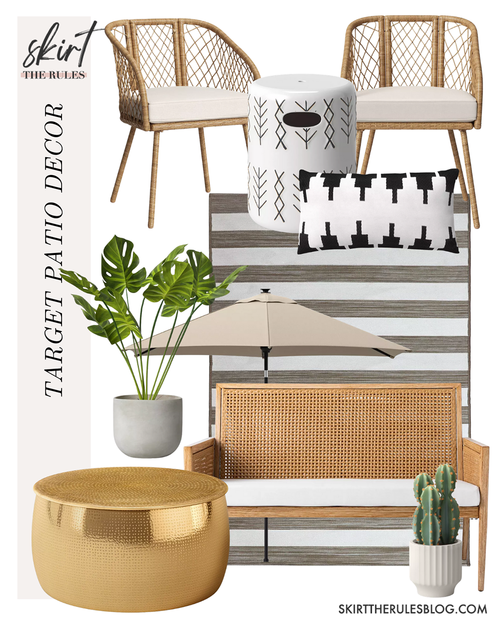 Rattan accent chairs / White drum side table / Black and white outdoor pillow / Grey and white striped outdoor rug / Beige patio umbrella / Wicker love seat / Gray concrete planter / Gold hammered metal coffee table / Small textured planter