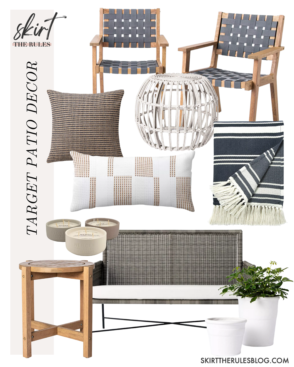 Gray & wood patio chairs / White wicker side table / Navy textured throw pillow / Tan and white lumbar pillow / Navy striped blanket / Ceramic candles / Wooden accent table / Gray outdoor loveseat / White planters