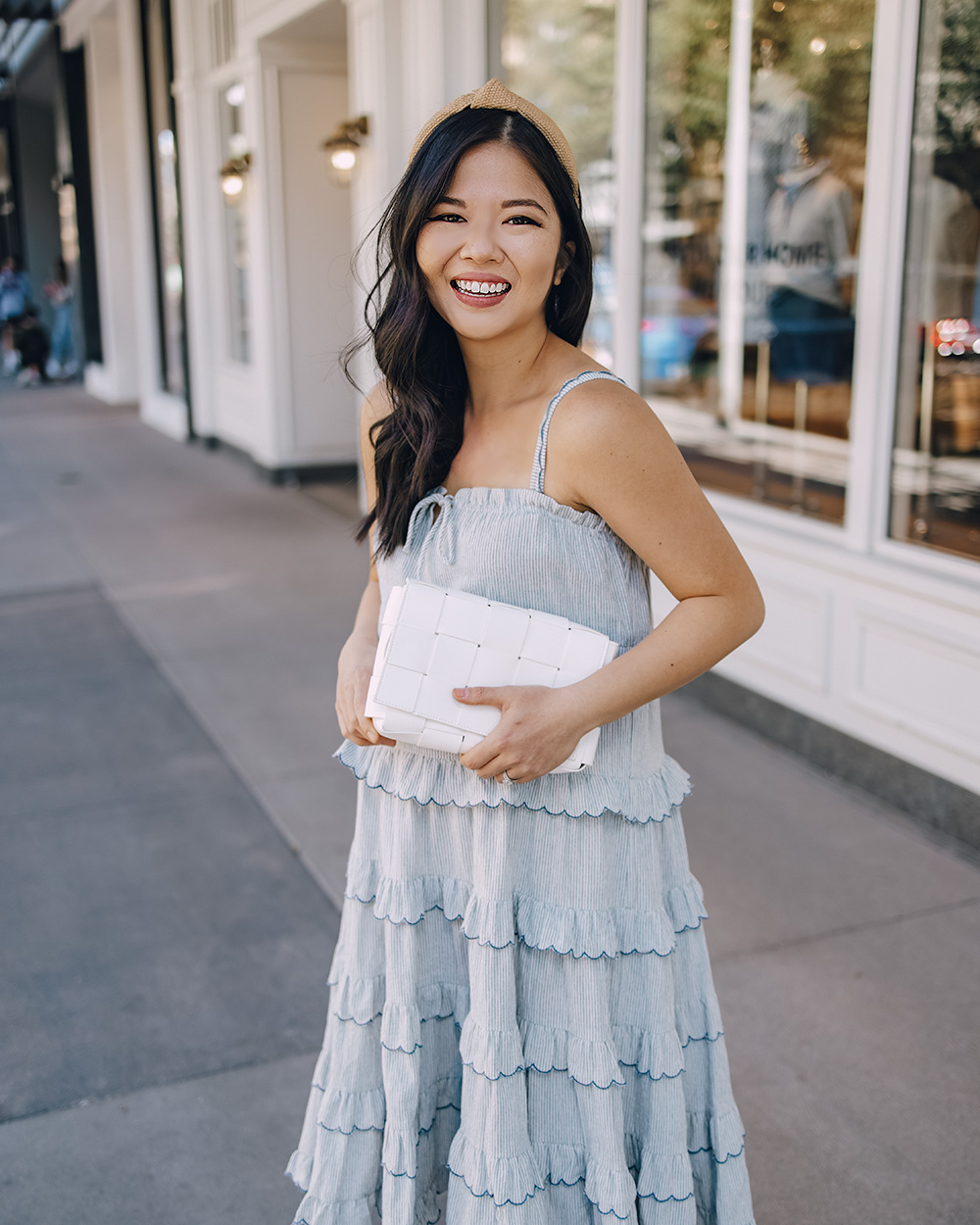 Light blue midi dress with scallops (S) / White woven clutch / Nude strappy mule sandals (6.5 TTS, similar here) – all c/o of Red Dress / Straw headband / Charlotte Tilbury lipstick in ‘Pillow Talk’