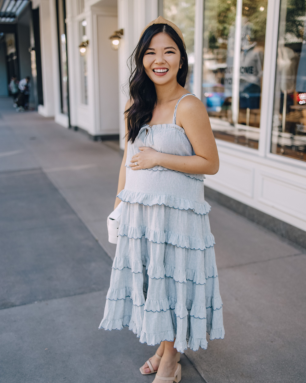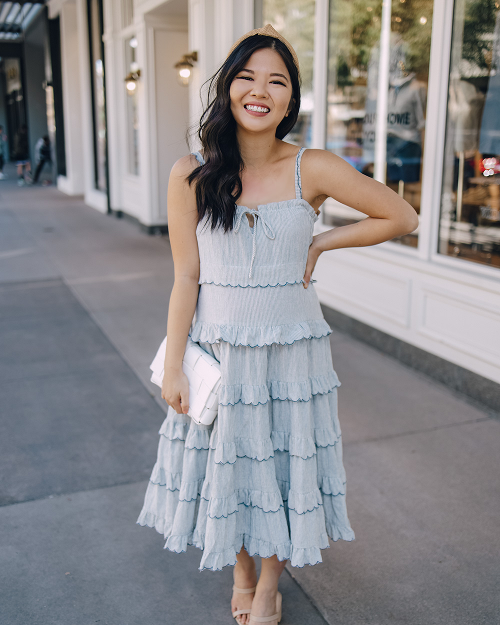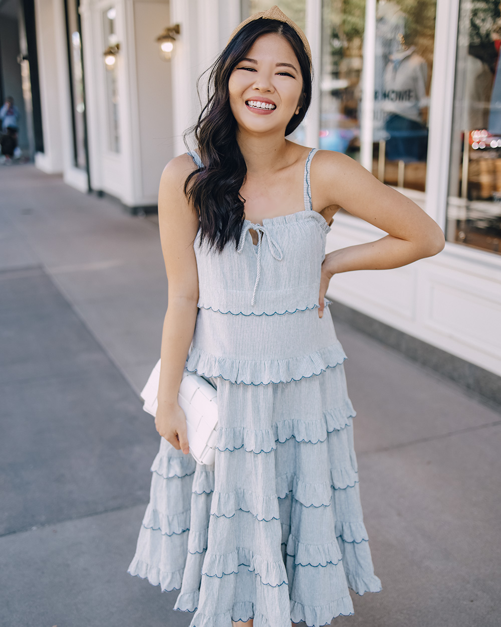 If you’re looking for an every day spring dress, or a spring bridal shower dress, a baby shower dress, an Easter dress – or for really any special occasion, this light blue linen midi dress is it! Between the ruffles and scallops (even the straps are scalloped!), it’s too cute to pass up. The tiers do add a bit of weight to it, but as you can see in the first pic, it still passes the twirl test!