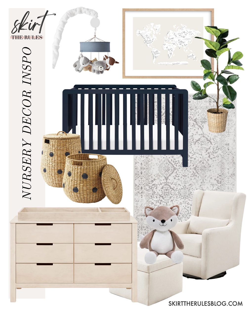 Navy crib / Animal musical mobile / Gray area rug / Faux rubber plant / Navy pom pom woven storage baskets / Cream glider with ottoman / Fox stuffed animal / United States map wall art / Natural wood changing table dresser