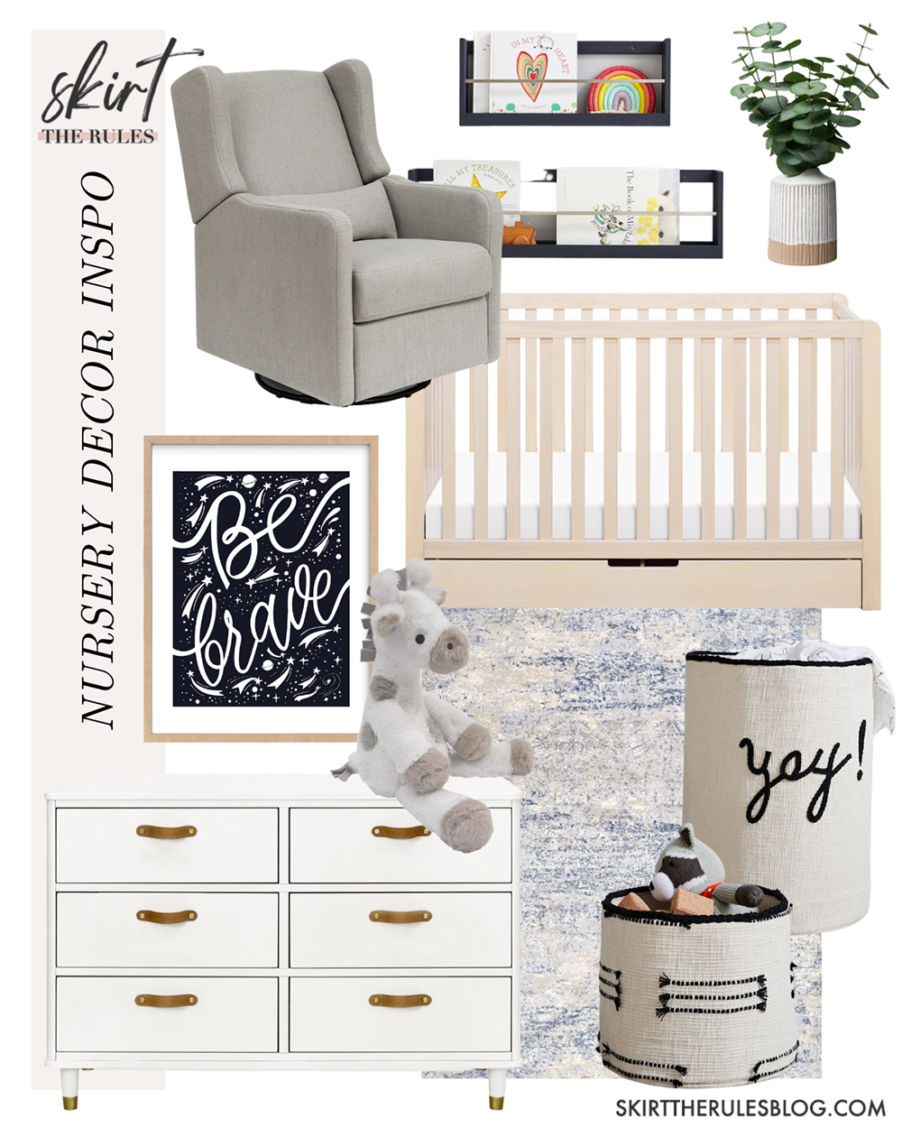 Natural wooden crib with trundle drawer / Light gray glider and recliner / Navy children’s bookshelves / Faux eucalyptus plant / White changing table dresser with leather handles / Be Brave print / Blue and gray abstract area rug / Giraffe stuffed animal / Black and white woven storage baskets