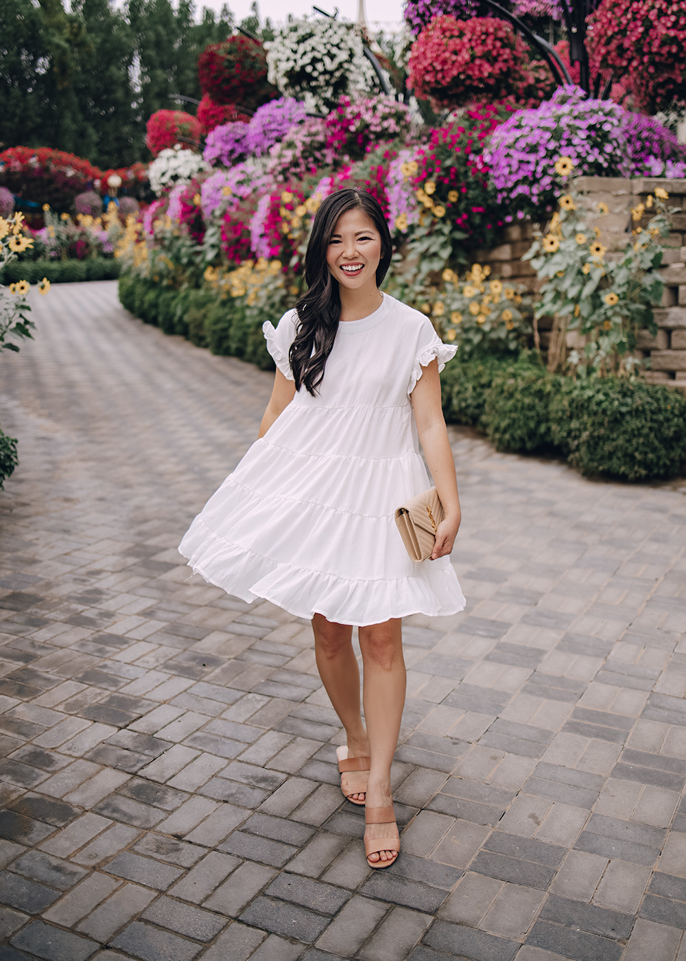 White ruffle dress (XS – non-maternity, but bump friendly) / Straw headband / Beige quilted purse / Woven strappy mules (6.5 TTS)