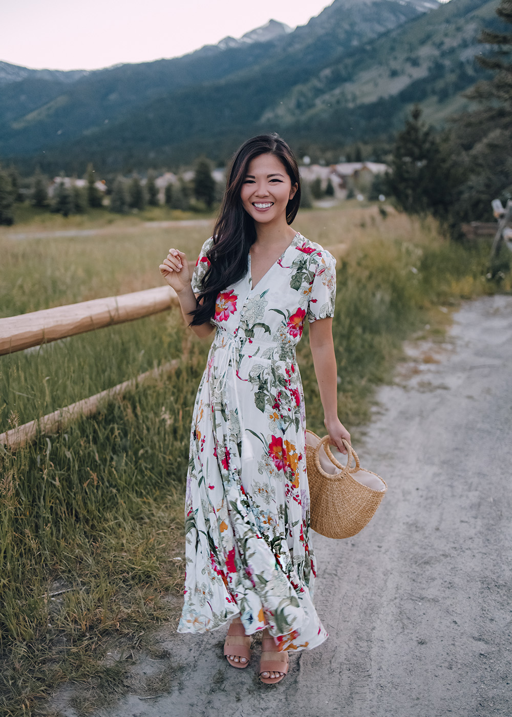 White cherry print maxi dress (S) / White straw circle bag / Similar canvas espadrille wedges