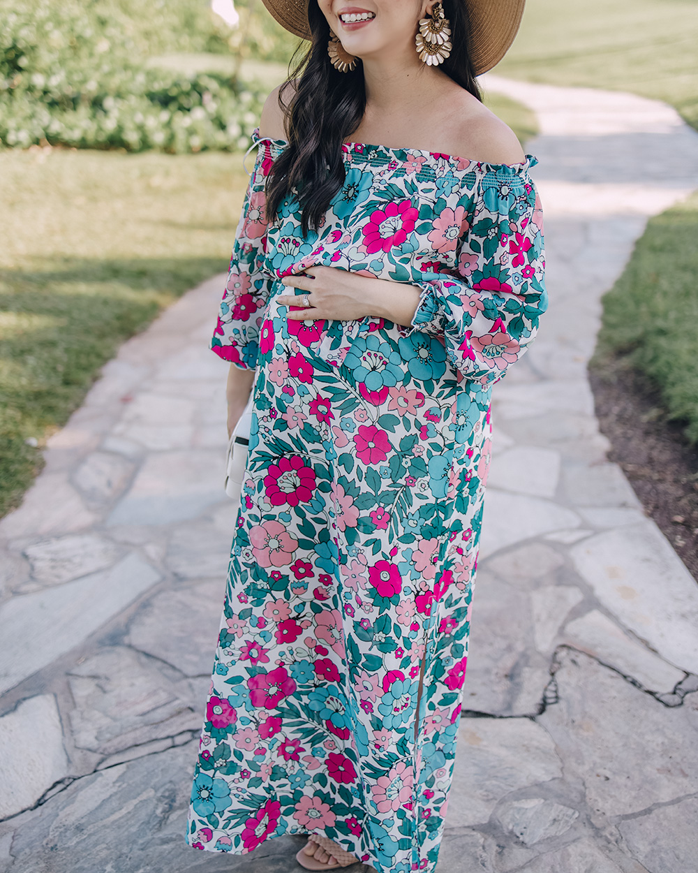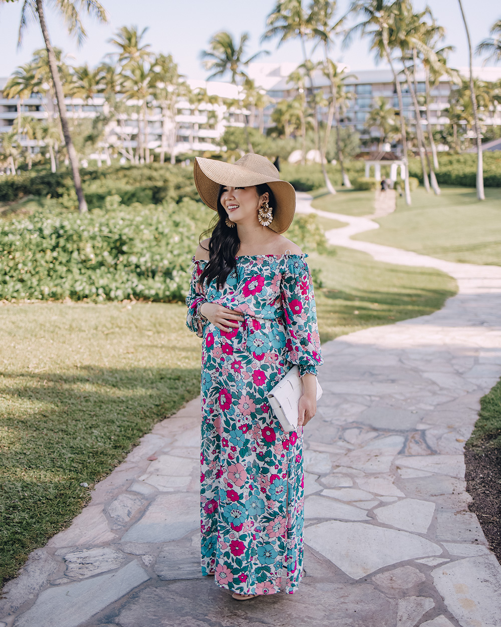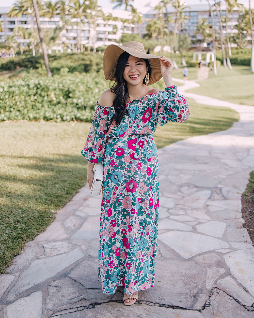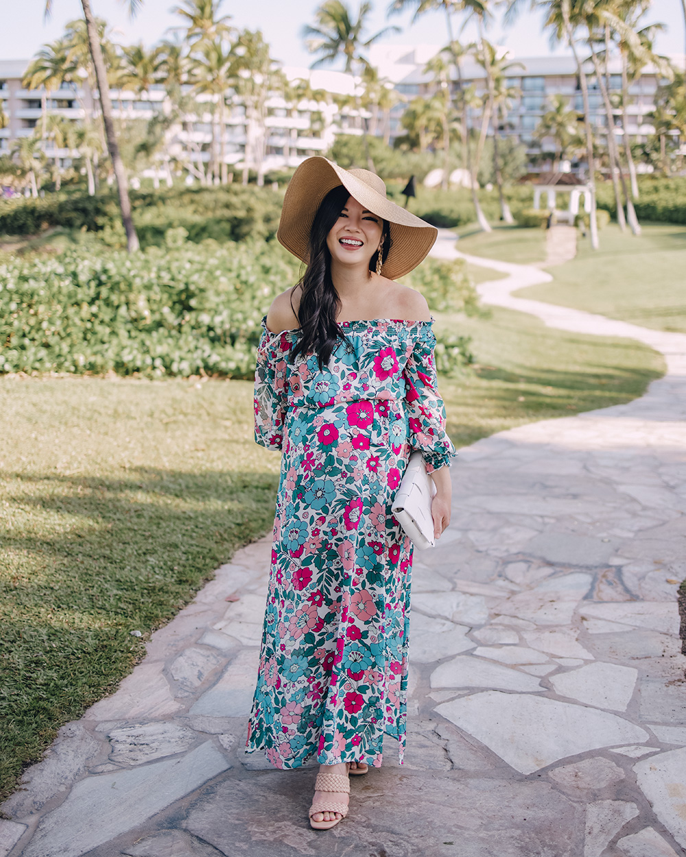 I love my neutrals, but there’s something about a beach vacation that makes colorful, summer outfits irresistible. So it was aloha at first sight with this turquoise and fuchsia floral maxi dress. From the tropical colors, the off the shoulder neckline and the sassy leg slit, it’s the perfect spring or summer dress!