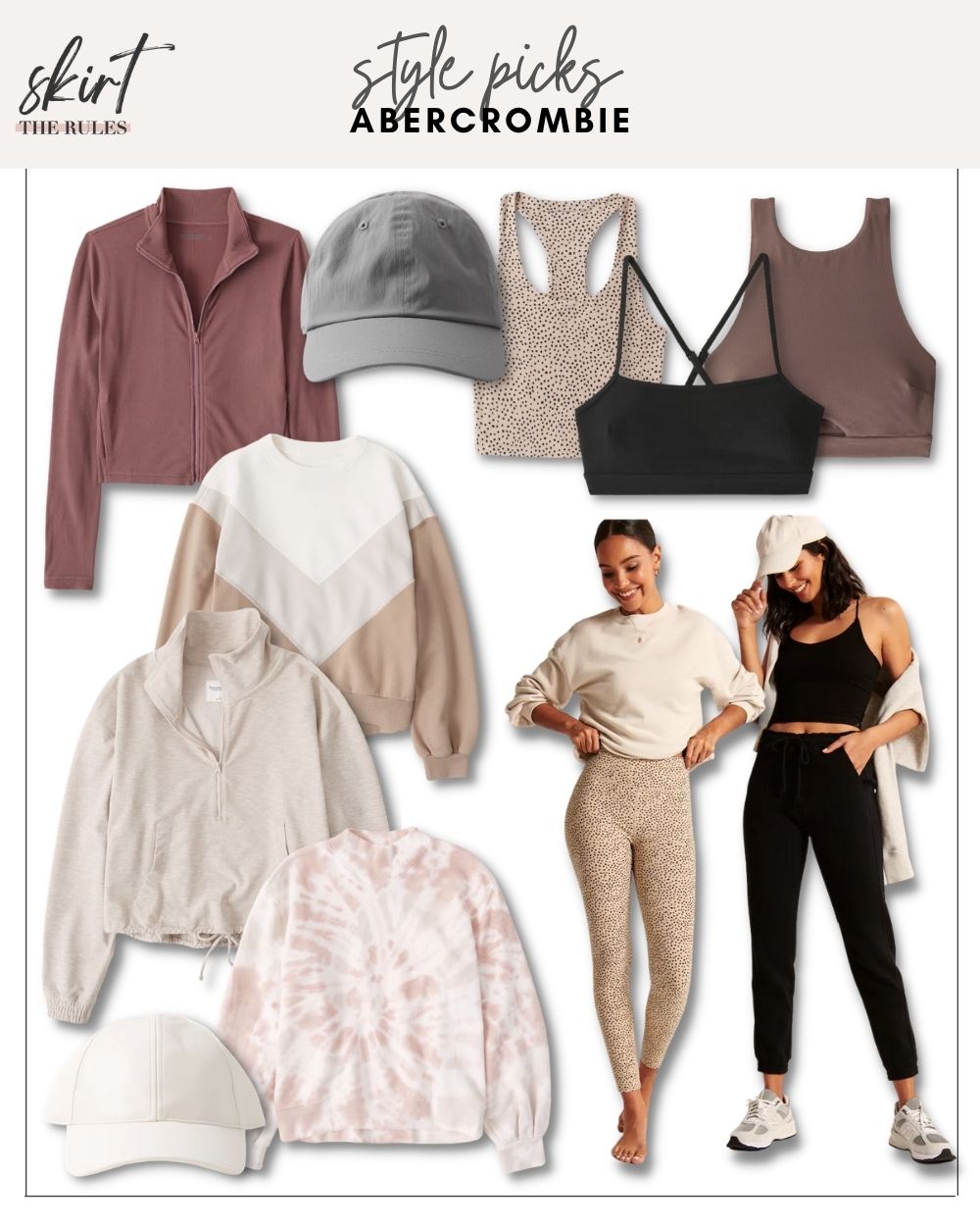 Dark pink zip up jacket / Colorblock sweatshirt / Beige quarter zip pullover / Pink tie dye sweatshirt / Cream leather baseball hat / Gray baseball cap / Leopard sports bra / Black bralette / Mauve sports bra / Leopard high waisted leggings / Cream sweatshirt / Black crop top / Black jogger pants