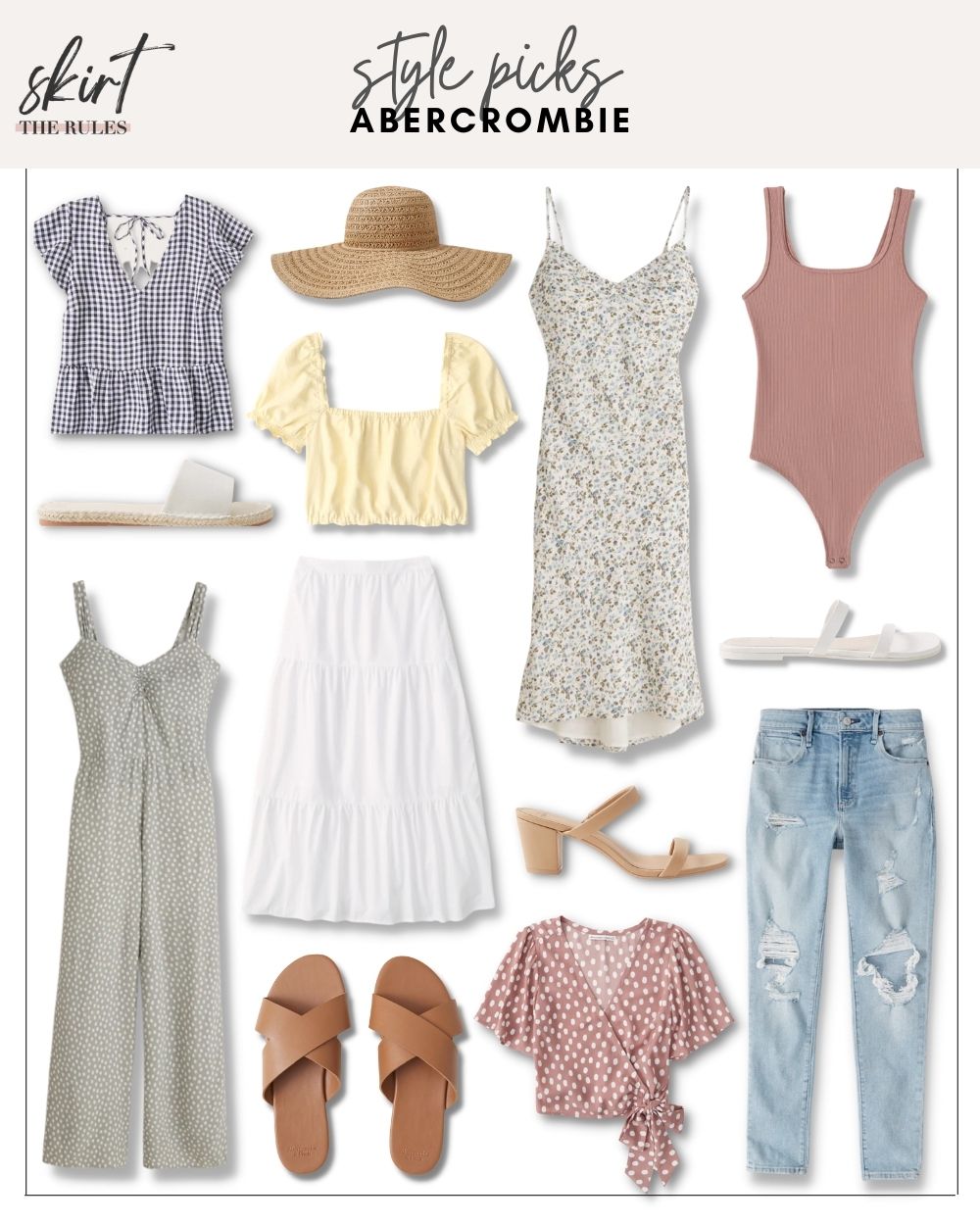 Navy gingham peplum top / White slide sandals / Light green jumpsuit / Straw floppy hat / Yellow puff sleeve top / White midi skirt / Brown slide sandals / Floral slip dress / Nude mules / Polka dot wrap top / Pink bodysuit / White slide sandals / Light wash ripped skinny jeans