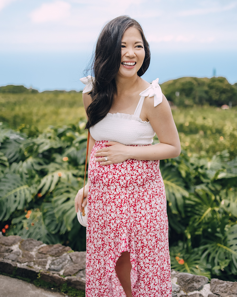 White smocked crop top with tie straps (S) / Red floral midi skirt with leg slit (S – non-maternity, but bump friendly!) / White straw circle bag / Brown slide sandals (old, linked similar) / Charlotte Tilbury lipstick in ‘Pillow Talk’