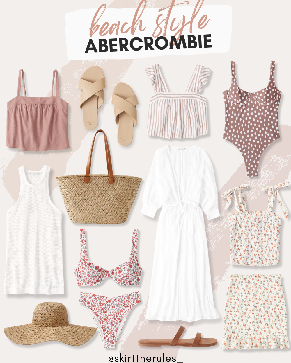 Pink crop top / Nude slide sandals / Cream sweater tank / Straw floppy hat / Straw tote bag / Pink floral bikini top / Pink floral bikini bottoms / Nude and white striped crop top / White coverup dress / Brown slide sandals / Pink polka dot swimsuit / Orange print crop top / Orange print skirt