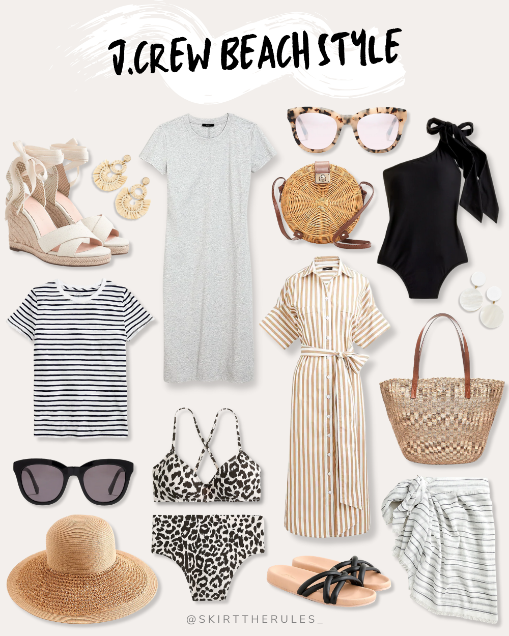 Straw earrings / Espadrille wedges / Striped t-shirt / Black oversized sunglasses / Straw hat / Gray t-shirt dress / Leopard bikini top / Leopard high waisted bikini bottoms / Tortoise oversized sunglasses / Rattan circle bag / Striped shirt dress / Black slide sandals / Black one shoulder swimsuit / Straw tote bag / White statement earrings / Striped sarong