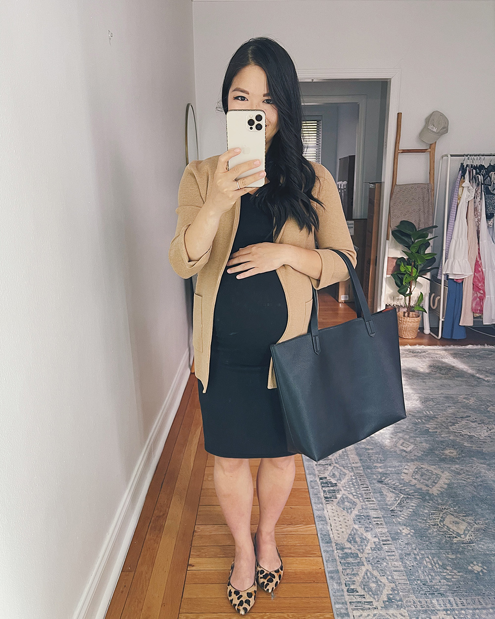 Black maternity tank dress (S) / Camel sweater blazer (XXS) / Black faux leather tote bag with zipper / Similar leopard flats