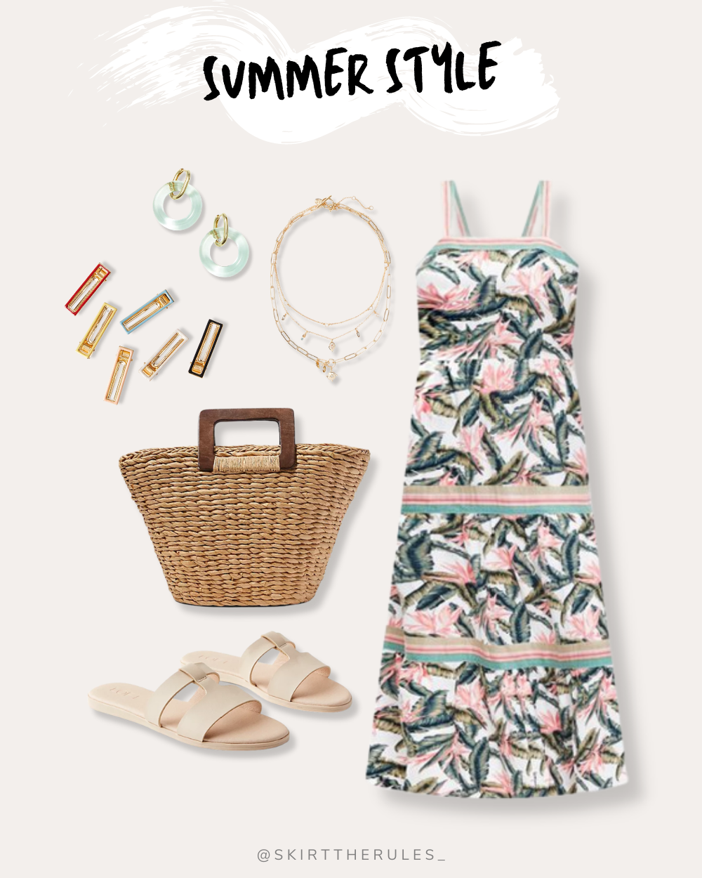 Tropical palm print dress / Gold layered necklace / Hair clips / Mint circle earrings / Straw tote bag / Beige slide sandals