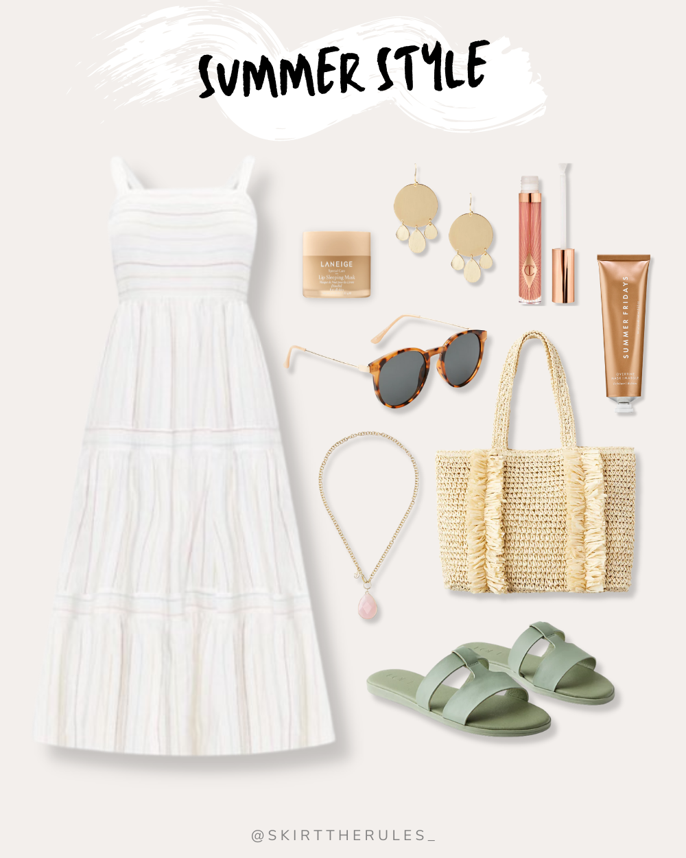 White maxi dress / Straw tote bag / Mint slide sandals / Tortoise sunglasses / Pink necklace / Gold disc earrings