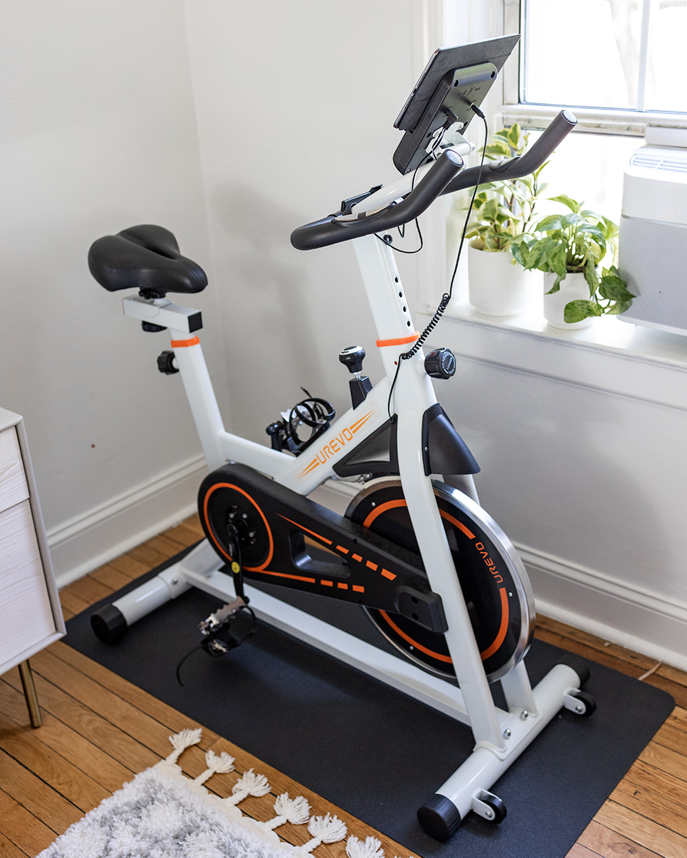 The quality doesn’t compare to the Peleton bike, but it gets the job done. If you go into this $200 purchase knowing that the quality of the product isn’t the same as a $2,000+ bike, then it really helps to level your expectations. I’ve taken many in-person classes at the Peleton studio in Chelsea, so I fortunately have a frame of reference. Riding on the UREVO bike isn’t as smooth and it doesn’t have a stunning 21” touchscreen tablet built into it, but the lack of a few luxuries doesn’t stop me from breaking a sweat and getting my heart rate up for a good workout.