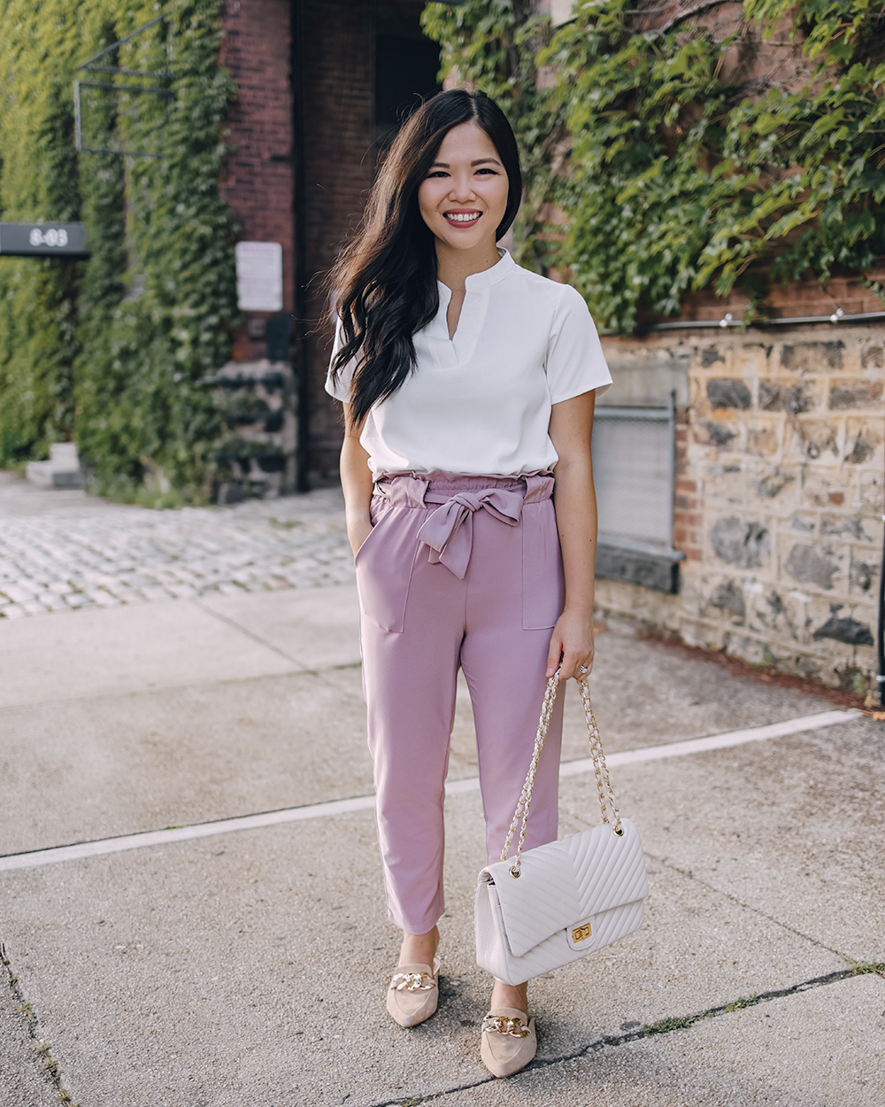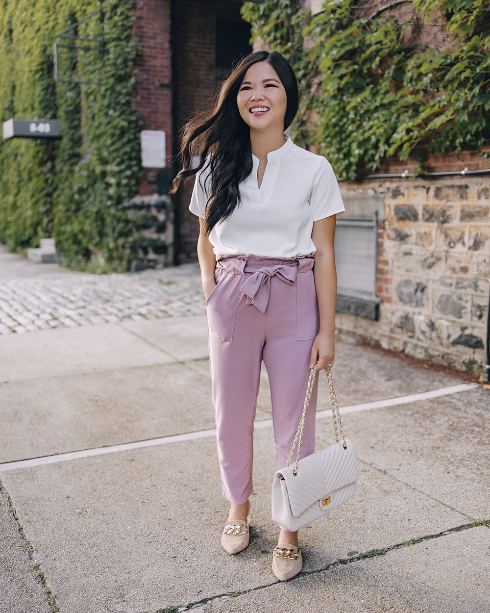 I have a little over one month of maternity leave left, and while I’m not emotionally ready for the big transition, I am looking forward to wearing “real clothes” during the week. Of course, I’m still planning to keep things very comfy. I saw that these paperbag waist pants had really great reviews (4 stars with nearly 13,000 reviews), so I bought them in this pretty lilac color for now (listed as “Puce”) and a dark mustard color for fall (listed as “Ginger”).