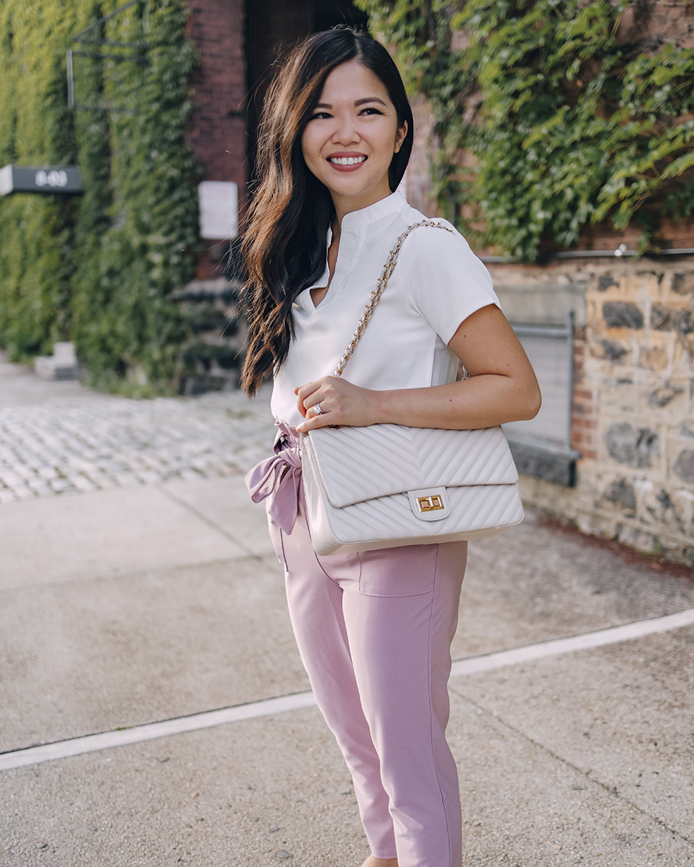 Left: J.Crew sweater blazer (XXS) / Similar white tank top / Lilac work pants (S) / Similar leopard flats / Right: White short sleeve top (S) / Lilac work pants (S) / Beige chain link purse / Taupe loafer mules (6.5 TTS)