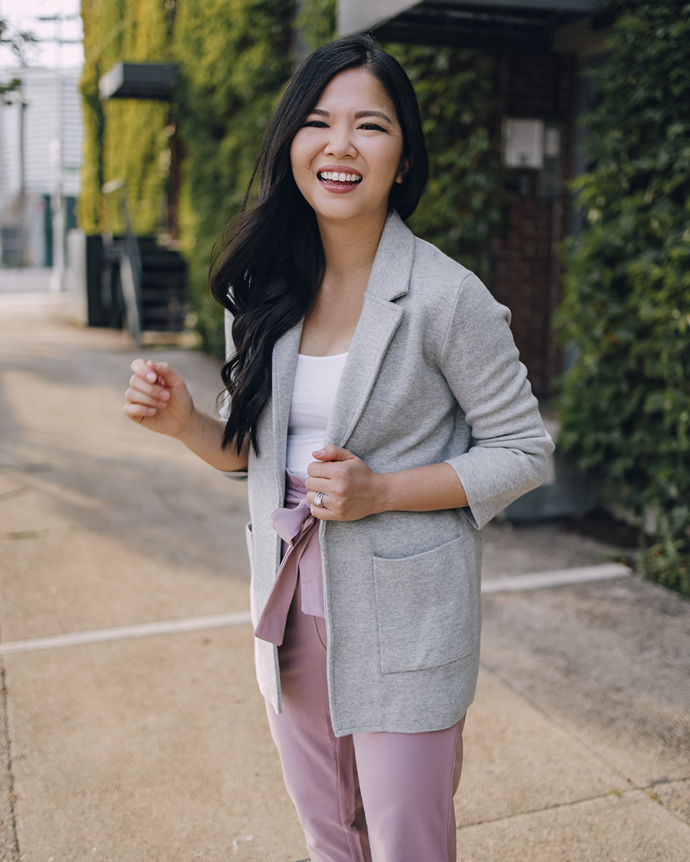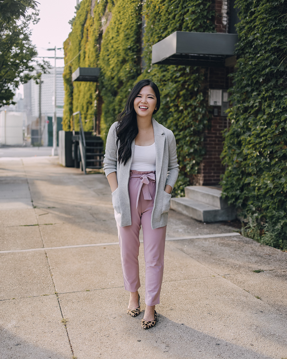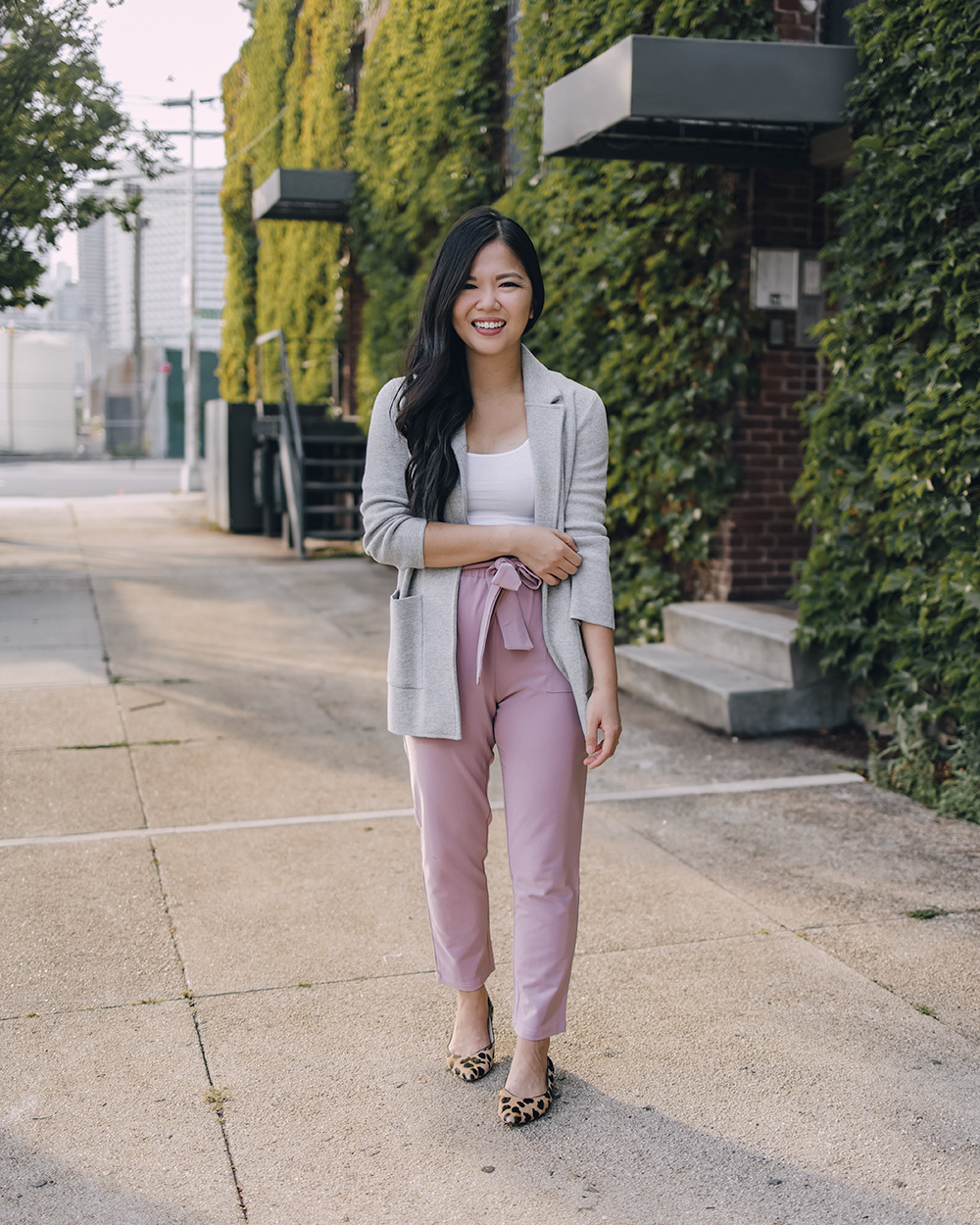 I got them in an XS and I think they’re super flattering (though I might try a S for a more relaxed fit while I work on my postpartum body). For now, I’m conjuring up all the ways I could wear this to work – with a crisp white short sleeve blouse or my all-time favorite sweater blazer. If you have a business casual dress code at work, I would keep the top pretty neutral and let the pants be the star of the show.