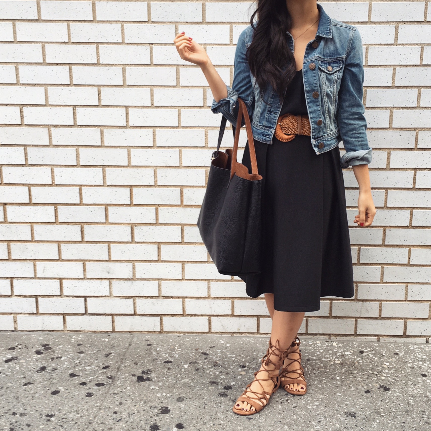 Denim Jacket / Black Cami / Midi Skirt / Woven Belt / Reversible Tote Bag / Gladiator Sandals