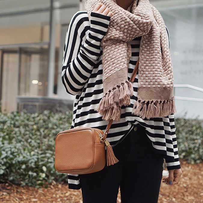 Similar black and white striped sweater / Frame ‘Le Skinny’ satine ripped jeans / GiGi New York ‘Madison’ crossbody bag (c/o) (50% off this week only!) / Halogen basket weave wrap scarf