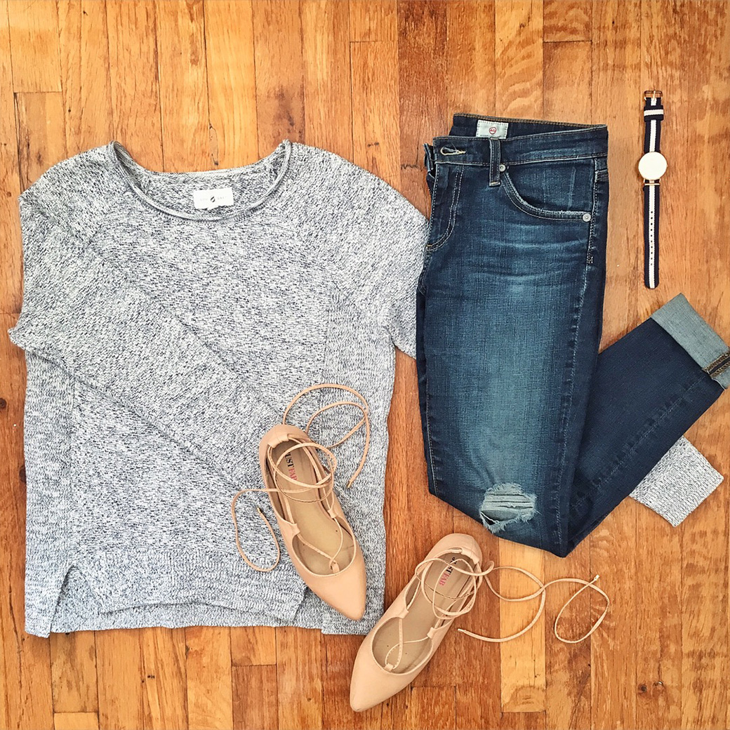 Another day, another sweater. I’m excited for lighter-layered days to come, but in the meantime, I’m transitioning out my dark chunky sweaters for happier hues (like this Lou & Grey sweater) that still keep me warm but look like spring. Also, I jumped on the lace-up flats bandwagon and I’m not mad about it.