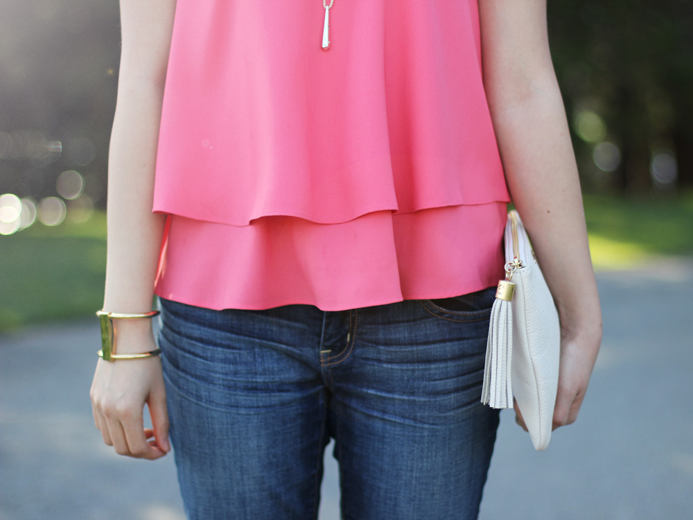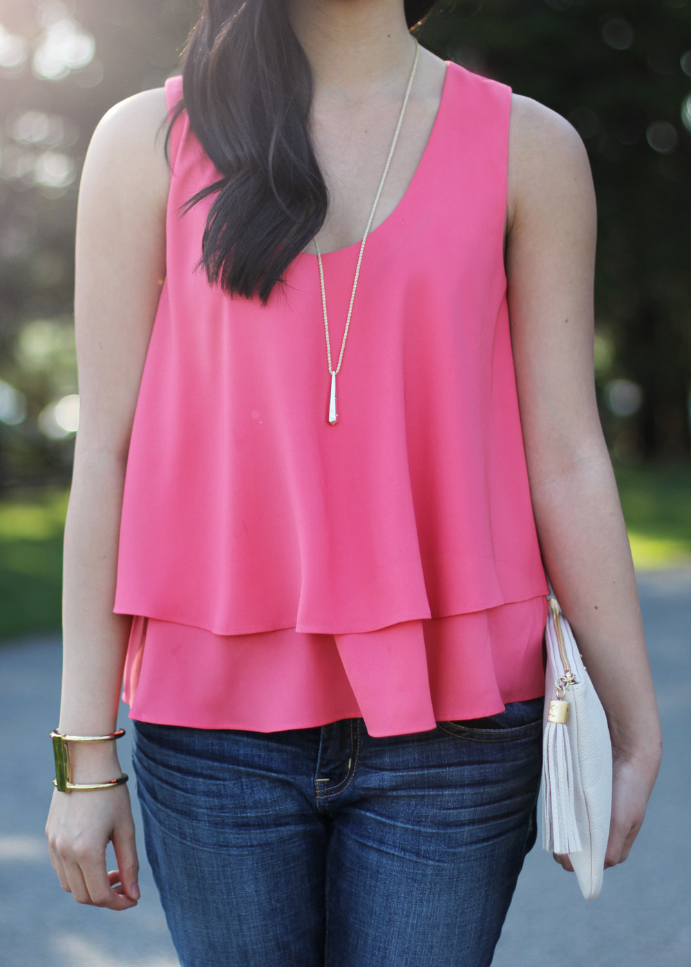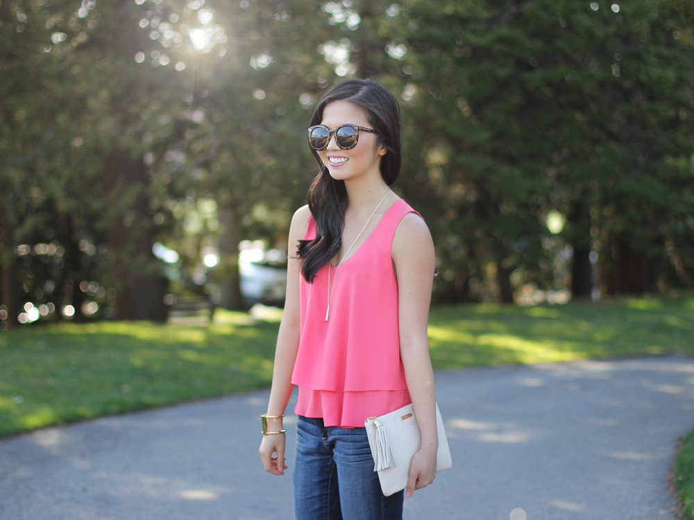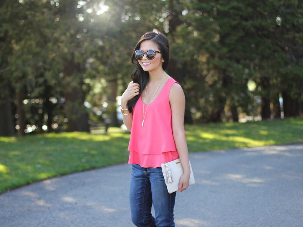 Call me crazy, but I’ve been considering it bare-legs weather ever since temps hit 50°F and now it’s time to show the arms a little love. It’s not the first time I’ve gone sleeveless this season either. Don’t get me wrong, I love my spring jackets (leather moto, anorak, denim or knit bomber!), but I’m ready to shed the extra layers. I’m loving this top from Ann Taylor. It comes in black, cream and a floral print, but the coral color is totally my jam. It’s bright and flowy and puts me completely at ease — spring weekend uniform for sure! Happy Friday friends!