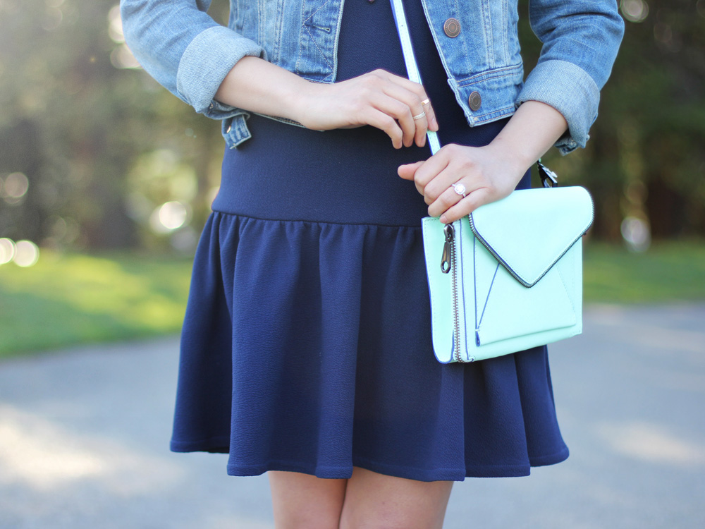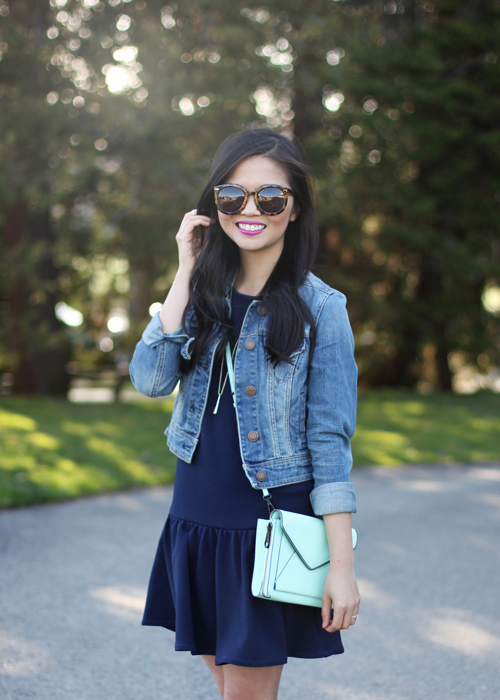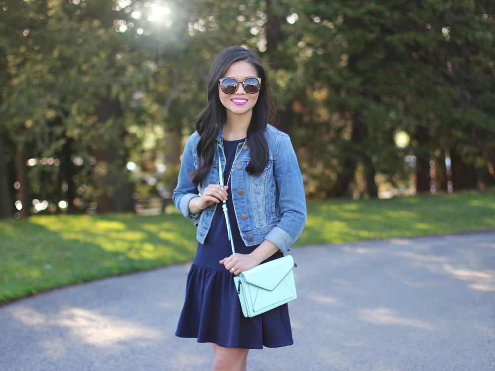 You know I love a good dropwaist dress (last seen here and here), but this navy one in particular has been a staple since I got it last fall. I probably wear it a couple times a month and have no plans on stopping! Last month, I wore it with a knit bomber, but this past weekend I opted for a denim jacket and as long as there’s a spring breeze in the air, I’ll keep switching it up with all kinds of different layers. A mint-colored crossbody bag and a bold lip color is all I need to complete this little spring update.