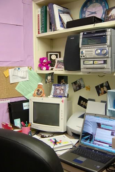 This was my desk area, complete with an anciently massive computer monitor and a color-coded class schedule. Coincidentally, the laptop screen is open to my defunct LiveJournal account — my original and very teen-angsty blog.