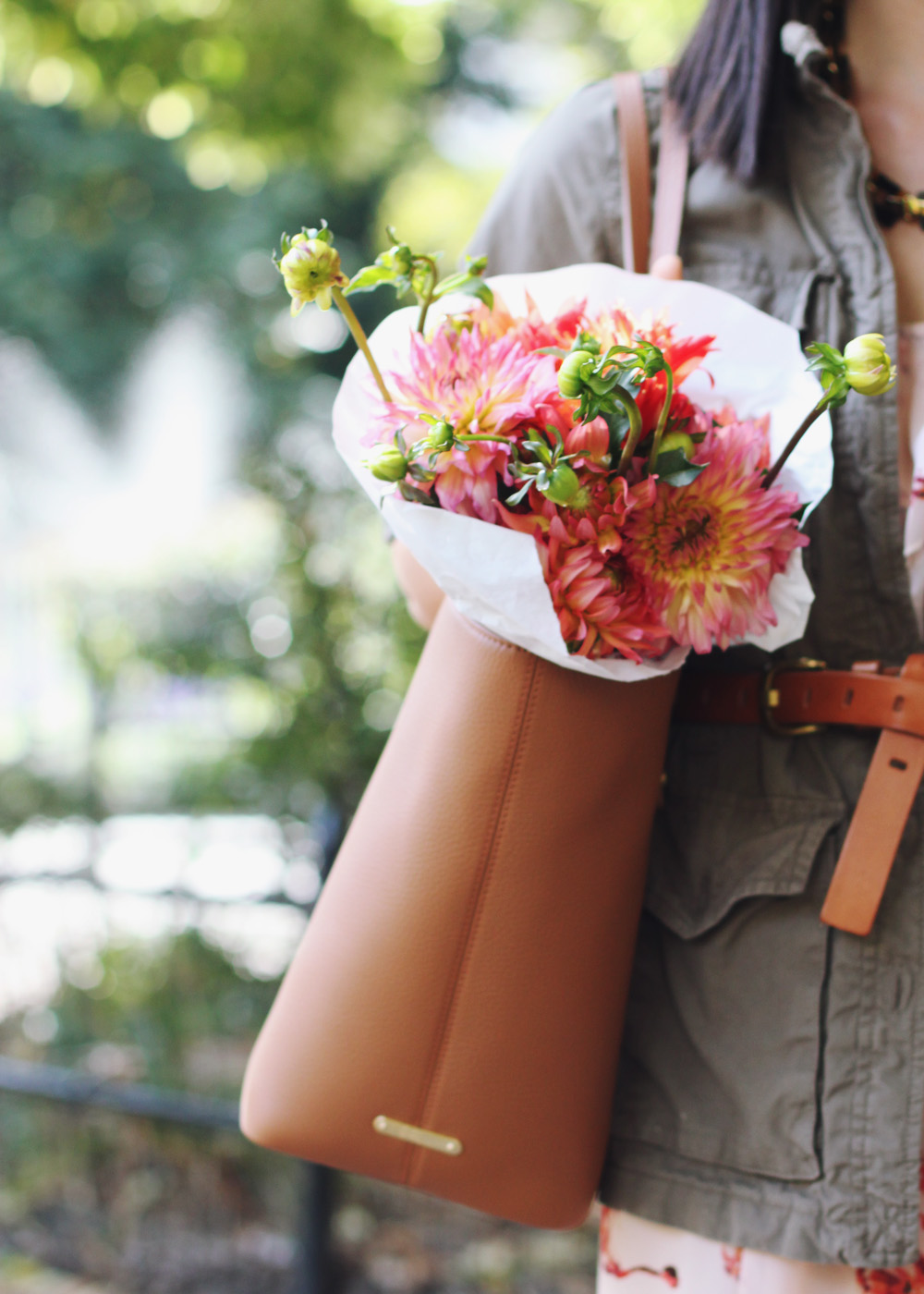 Wanna give your summer frock a little bit more longevity? There’s nothing a military jacket, tortoise/leopard jewelry, and one amazing cognac tote bag can’t fix!