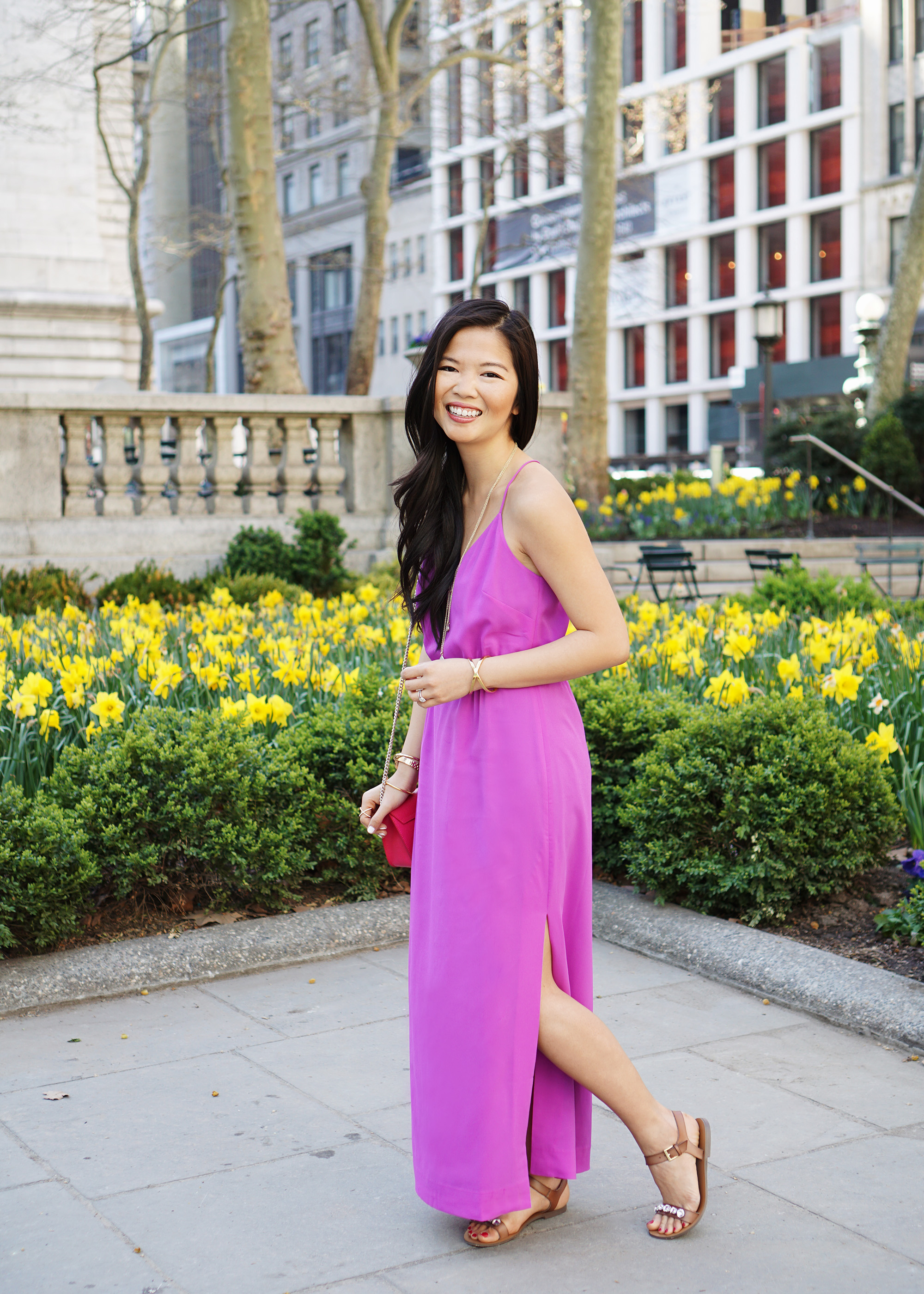 Outfit: J.Crew Factory racerback maxi dress in ‘Bright Amethyst’ (c/o Tanger Outlets) / LOFT tripe strand pendant necklace / Furla ‘Metropolis’ crossbody bag (c/o Tanger Outlets) / Movado ‘Bold’ crystal accent bangle watch (c/o) / BaubleBar ‘Mason’ pave ring / Kate Spade ‘Sailors Knot’ bangle / J.Crew Factory jeweled ankle-strap sandals (c/o Tanger Outlets) / Makeup: Too Faced Born this Way foundation in ‘Ivory’ /Bobbi Brown bronzing powder in ‘Golden Light’ / Dior ‘2-in-1 Prime & Conceal’ in ’02’/ Anastasia ‘Brow Wiz’ eyebrow pencil in ‘Dark Brown’ / Urban Decay ‘Naked’ eye palette / Make Up For Ever mascara / NARS blush in ‘Dolce Vita’ / NARS satin lip pencil in ‘Rikugien’