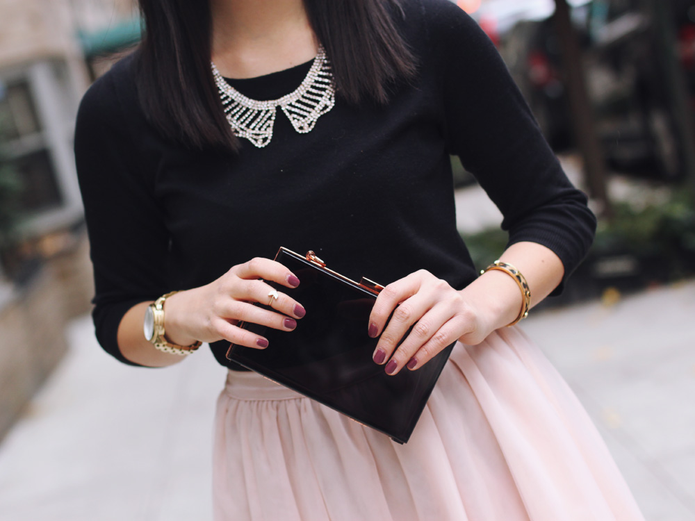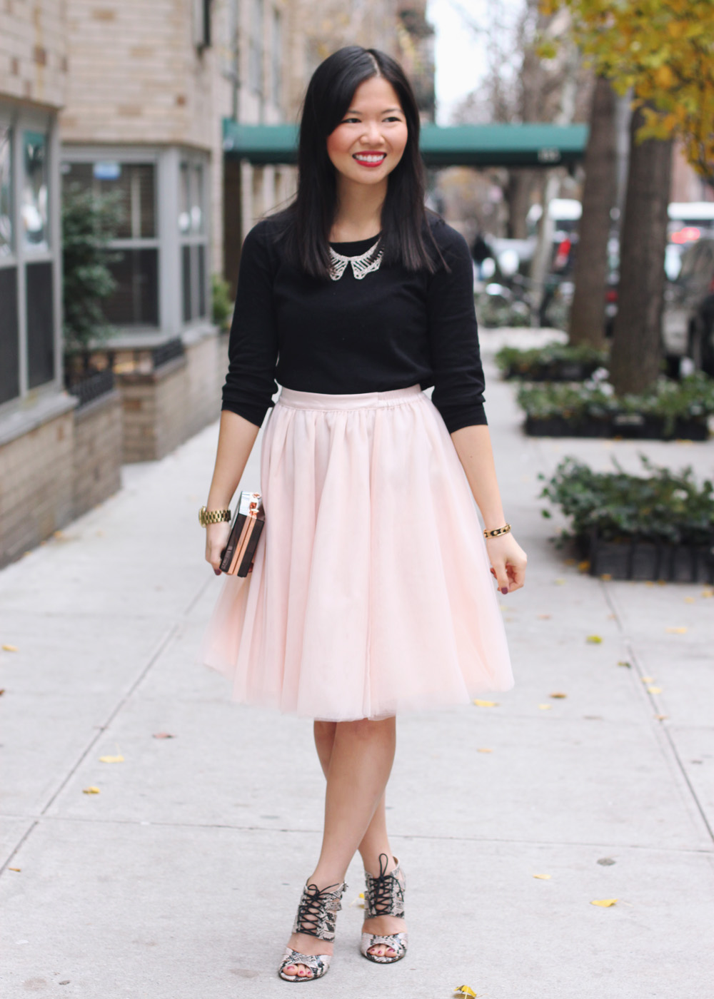 I’m obsessed with this pink tulle skirt and channeled Carrie Bradshaw the first time I wore it. With fall nipping at our heels, I paired the piece with one of the softest t-shirts I own. Darker accessories take this look from princess to punk.