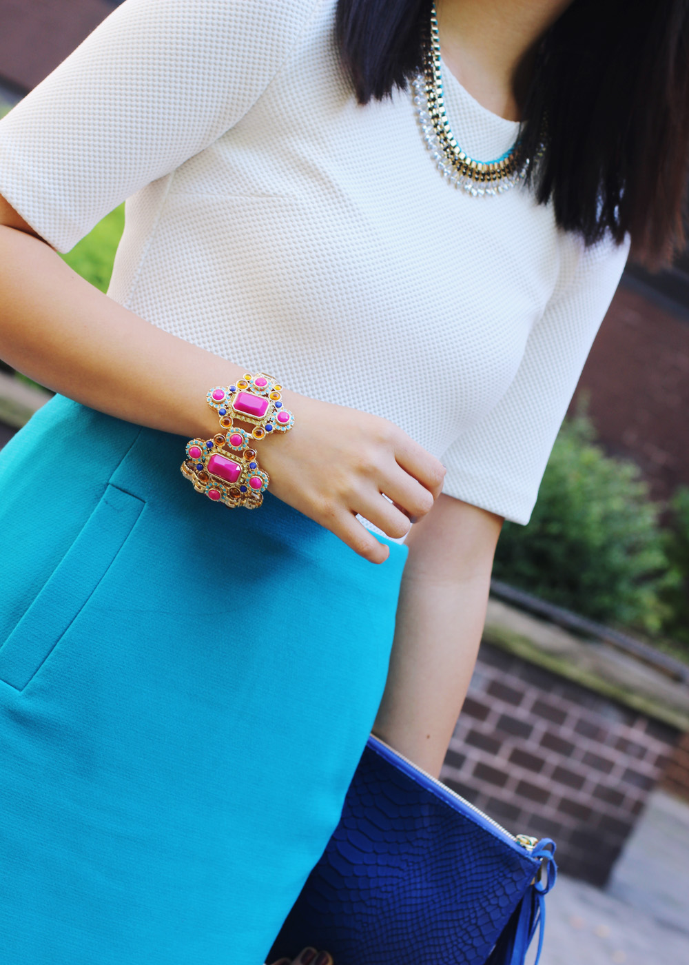 After a few outfits full of dark shades, I’m back to brights today. What can I say? I love what I love. And while I enjoy dabbling in fall colors like oxblood and mustard and muted tones like cream and camel, a good pop of color (or two or three) will never get old.