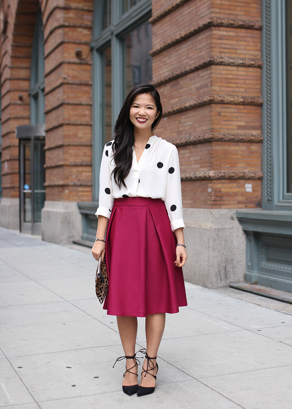 Outfit: LOFT polka dot split neck blouse / Chicwish midi skirt in ‘Violet‘ (c/o) / Clare Vivier leopard flat clutch / Kendra Scott ‘Liana’ bracelet (c/o) / Loren Hope ‘Clara’ mini bracelet (c/o) / Steve Madden ‘Raela’ lace up pumps / Makeup: Too Faced Born this Way foundation in ‘Ivory’/ Too Faced Endless Summer bronzer / MAC brow liner in ‘Deep Dark Brunette’ / NARS blush in ‘Dolce Vita’ / NARS velvet lip pencil in ‘Damned’