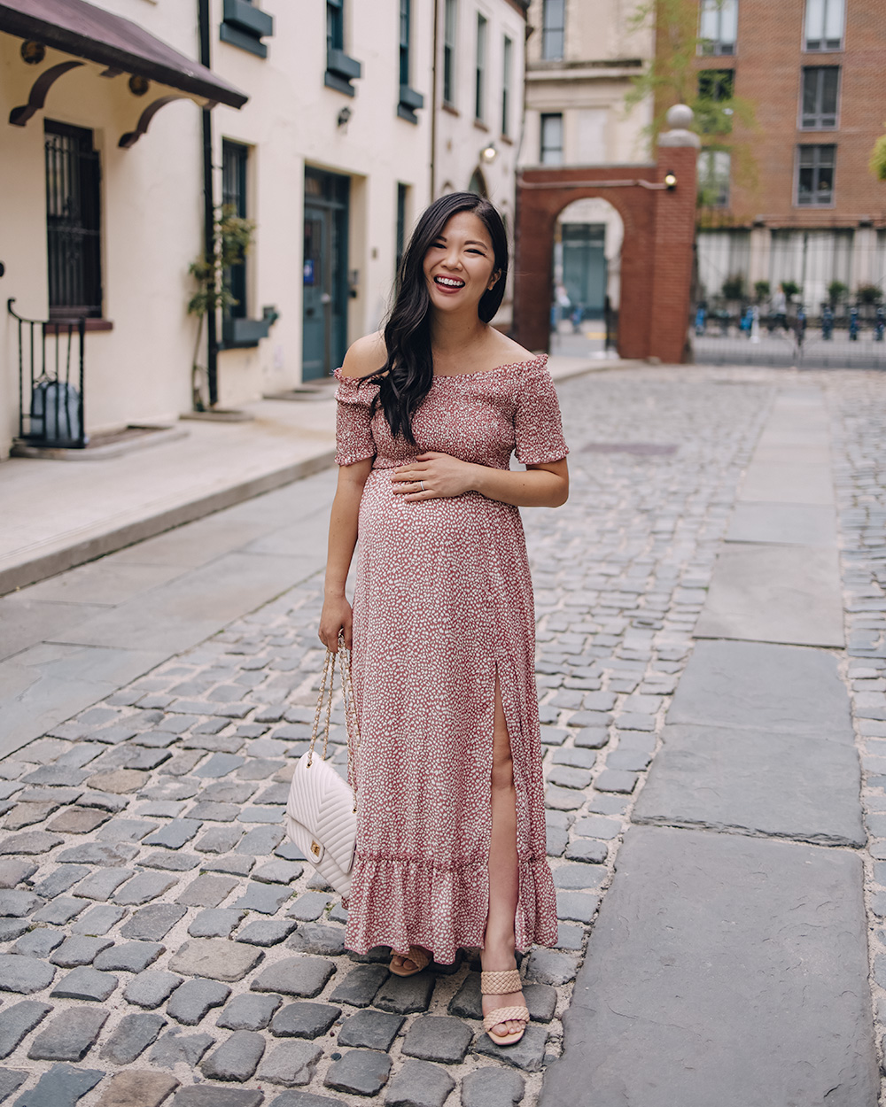 Amazon Maternity Friendly Pink Off the Shoulder Spotted Dress