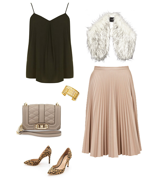 Cami // Pleated Skirt // Faux Fur Stole // Gold Cuff // Handbag // Leopard Pumps