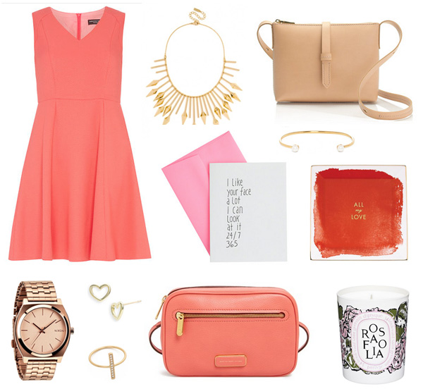 Dress // Necklace // Beige Bag // Card // Bracelet // Dish // Watch // Earrings // Ring // Pink Bag // Candle